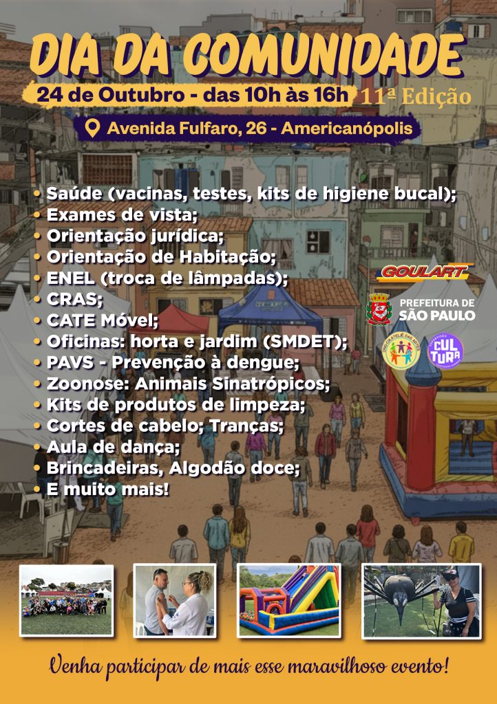 Na próxima sexta-feira, 24 de outubro, a Avenida Fulfaro, em Americanópolis, será o ponto de encontro da 11ª edição do Dia da Comunidade, uma grande ação social promovida pela Prefeitura de São Paulo. O evento leva até a comunidade, diversos serviços gratuitos, atividades culturais e lazer, voltados aos moradores da região.